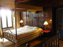 Una scala in pietra conduce alle camere, ciascuna arredata con un letto a baldacchino e un camino d’epoca.